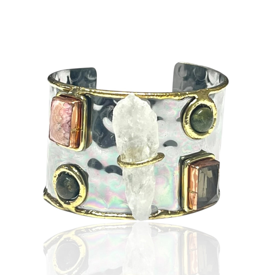 Crafted for impact, this wide brass cuff showcases multiple hand-set accents in varied shapes and finishes, including a raw central element for added depth. The handcrafted design makes it a standout piece for fusion and contemporary styling.