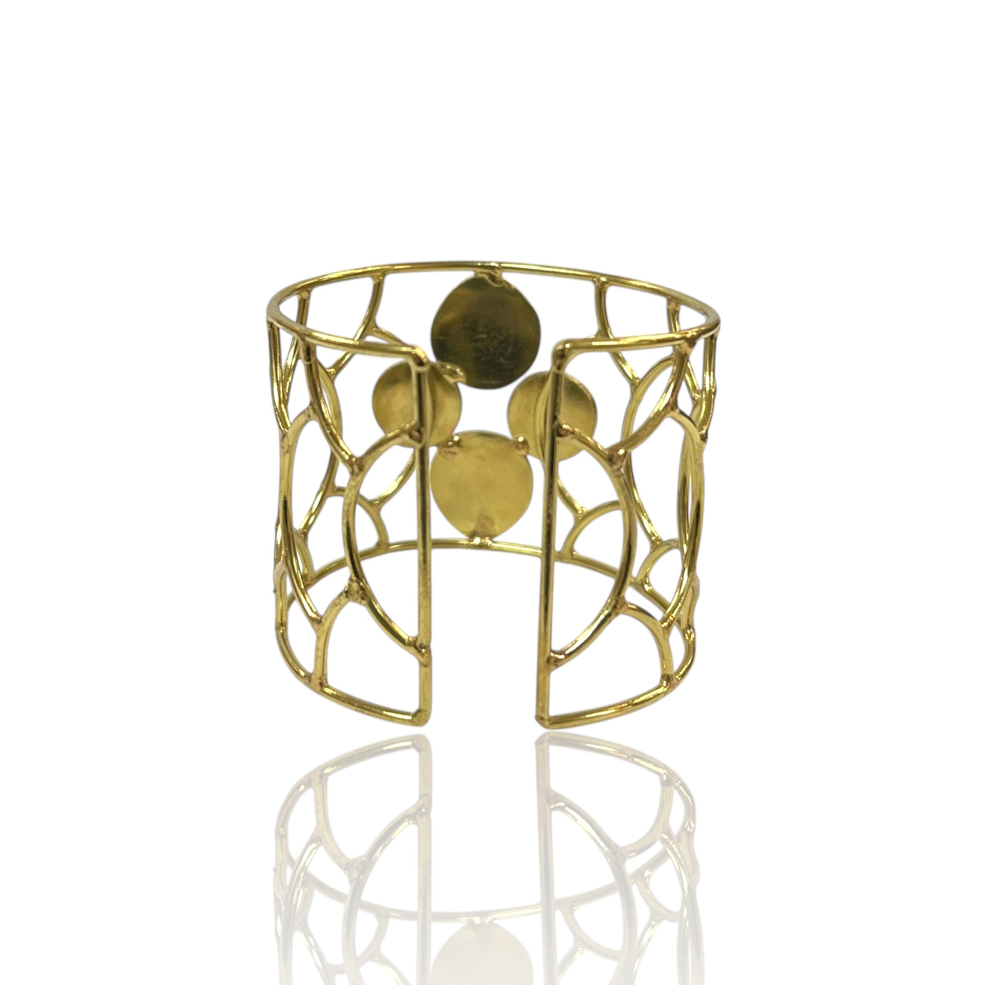 Unique and eye-catching, this brass cuff is designed with an airy lattice framework accented by a cluster of natural stones. The open design keeps it lightweight while the bold stone details create a striking focal point.